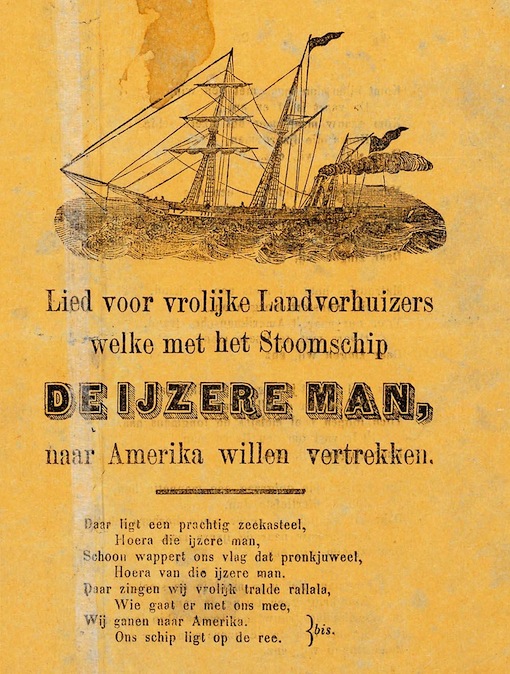 Pamflet met Lied voor vrolijke Landverhuizers welke met het Stoomschip DE IJZERE MAN, naar Amerika willen vertrekken. Credits: KB/Meertens Instituut